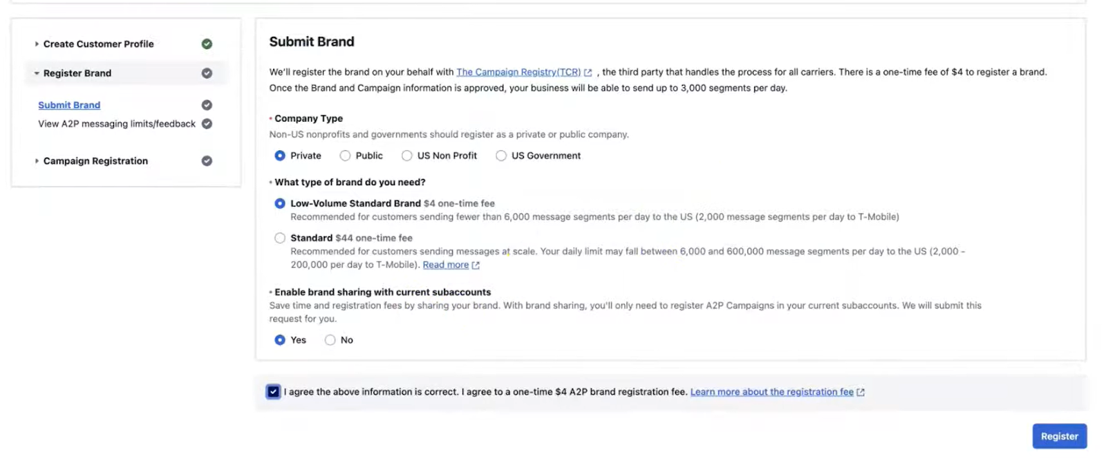- Once your profile is submitted, Twilio (and The Campaign Registry) will automatically verify your Tax ID against their database.