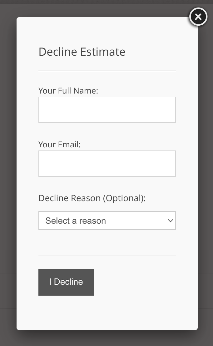 • The customer can click this link to decline the estimate and provide a decline reason (for example: price is too high, scope needs changes, not moving forward, etc.).