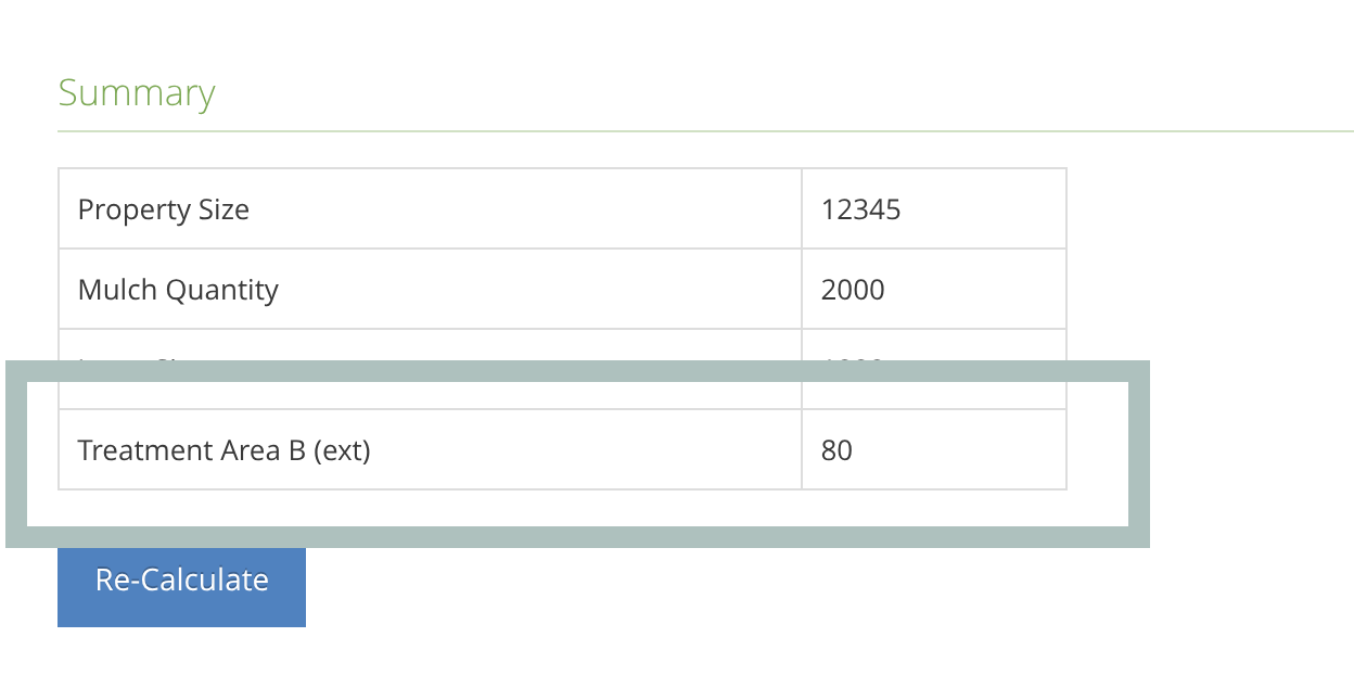 - Standard totals (Property Size, Mulch Quantity, Lawn Size)