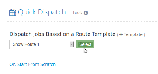 You will see your template (ex: “Snow Route 1”) in a drop-down list. Click “Select” to start the dispatch process.