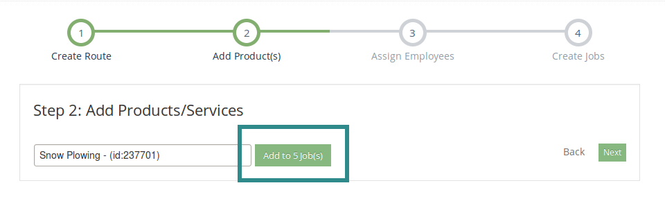 In the next step, you can add services or products from your catalog. Start typing a product name and Yardbook will show a matching product in the drop-down list. In this example, we will select “Snow Plowing”. Click the “Add to Jobs” button.