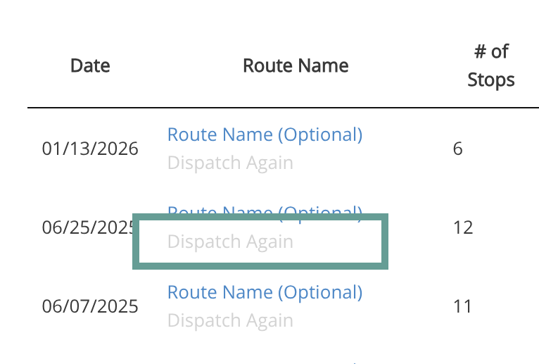 This will take you to the Route List View. Select an existing route and click on the “Dispatch Again” link.