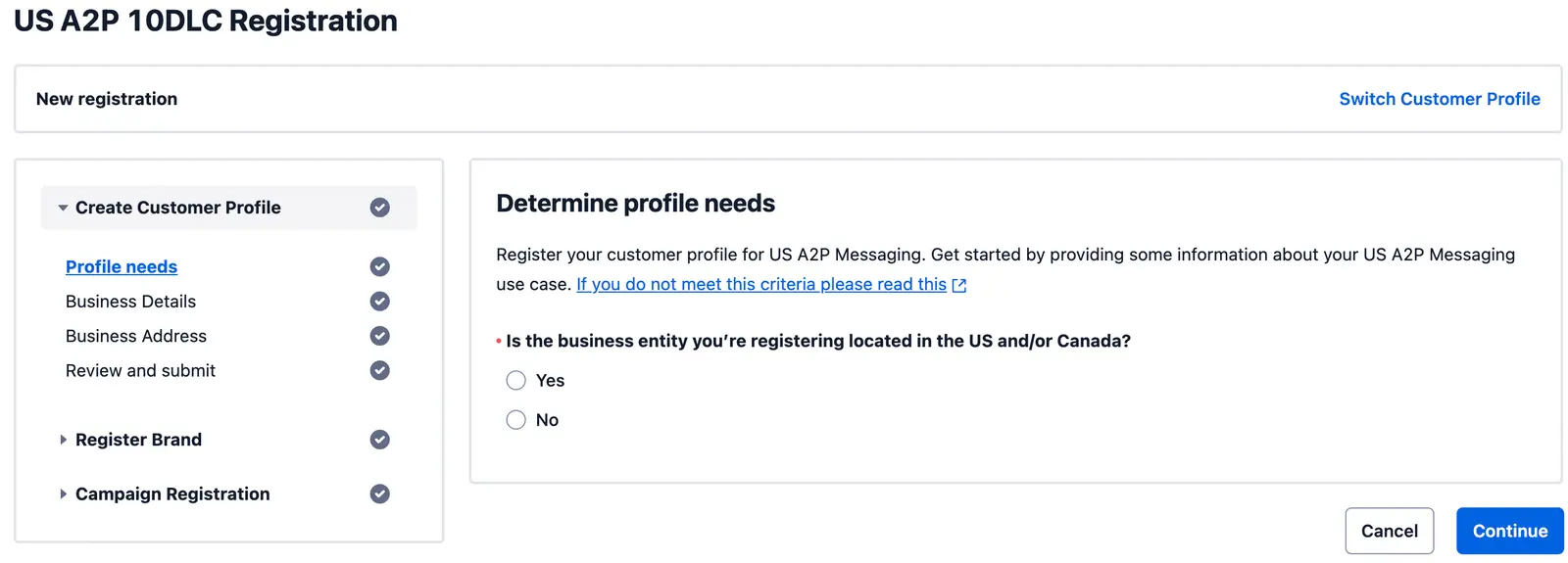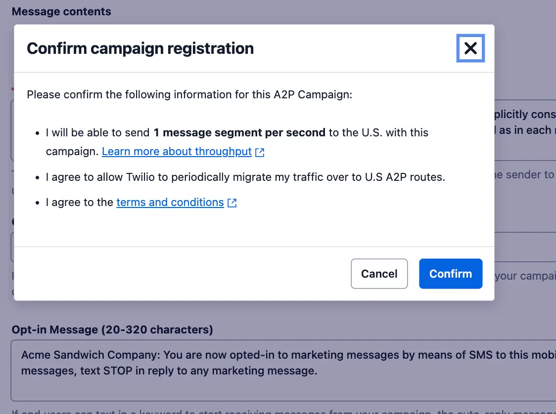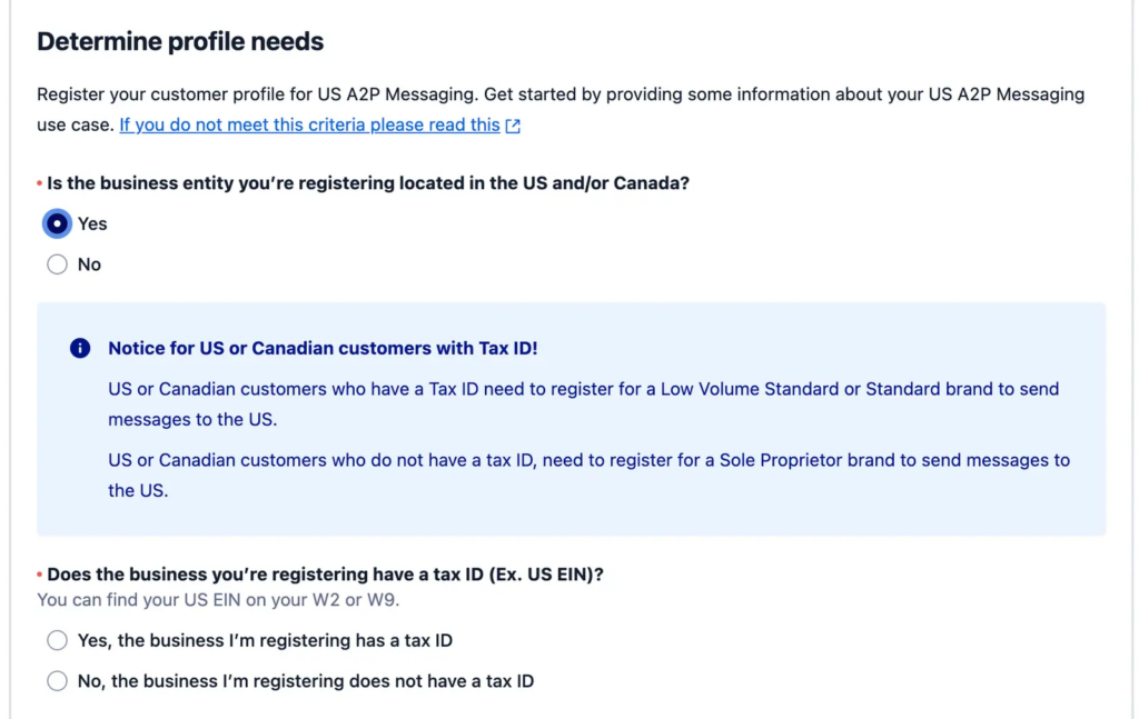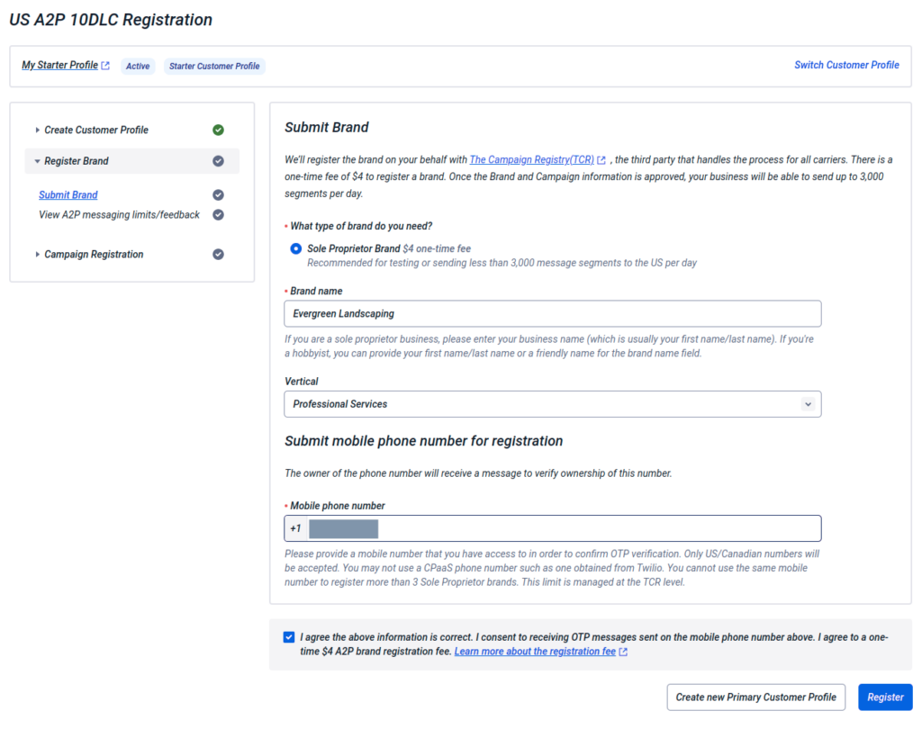 You’ll complete this in the Twilio Console using Twilio’s A2P 10DLC registration flow.