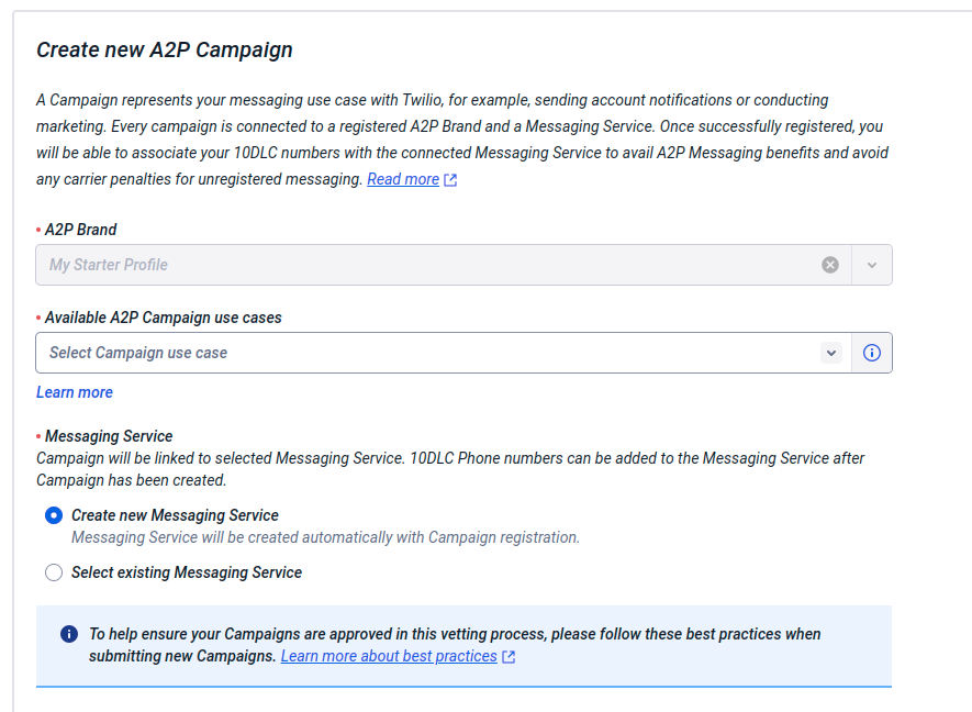 3. Messaging Service: You can select “Create New Messaging Service” if you haven’t created one before.